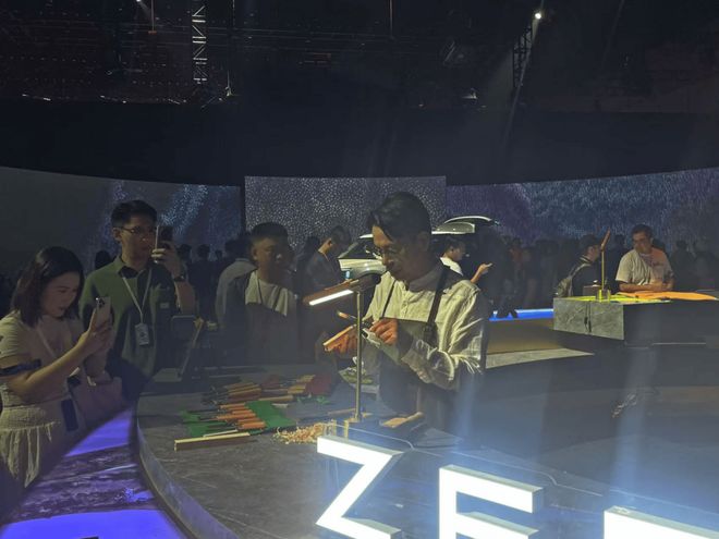 会场外,8辆极氪9X依次排开,硕大的前格栅搭配流畅、硬朗的车身线条,“杭州湾库里南”的强大气场肉眼可见;场馆内展示区,更是有两位模特“cosplay”手工匠人,一位专注雕刻真木、一位细心打磨水晶,暗合车内的材质工艺,进一步勾起了大家对“豪华细节”的好奇。