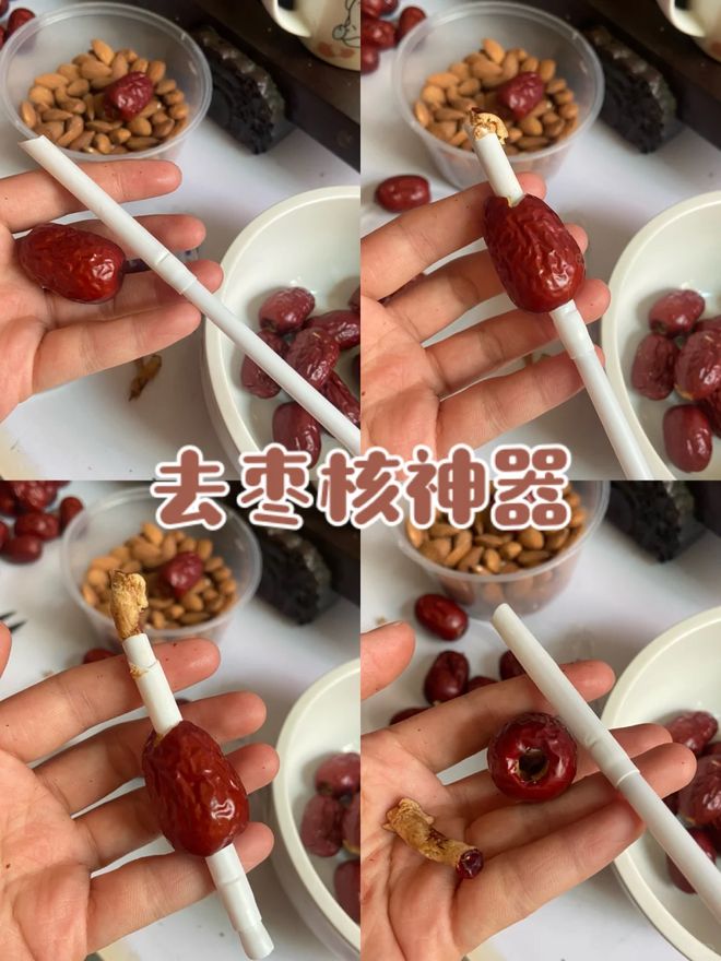 每次用红枣来制作奶枣,去枣核都是比较麻烦的,用筷子捅了半天都没有效果,终于发现原来吸管就能解决去枣核的难题,可以是这种酸奶的吸管,把它直接穿过红枣,
