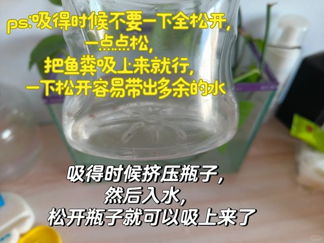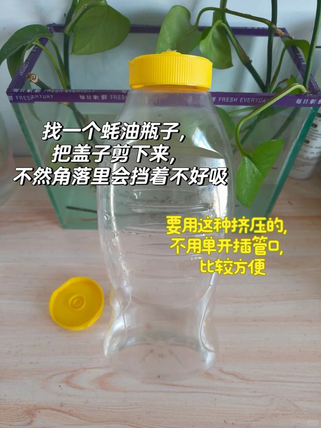 然后再找根吸管,就平时喝牛奶上面的习惯就行,浴缸大就找一个长一点的,然后直接插在瓶盖上面,放进鱼缸之后就慢慢挤压,直到将浴缸底部的脏东西吸上来。