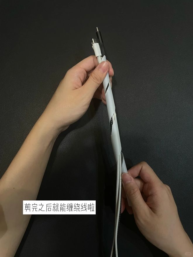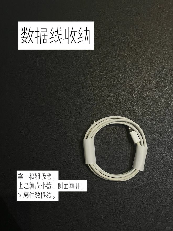 拿一根粗一点的吸管,然后剪成一小节,侧面再剪开,这样就可以用来包裹数据线了,把数据线缠绕在剪好的吸管里面,更加整齐。