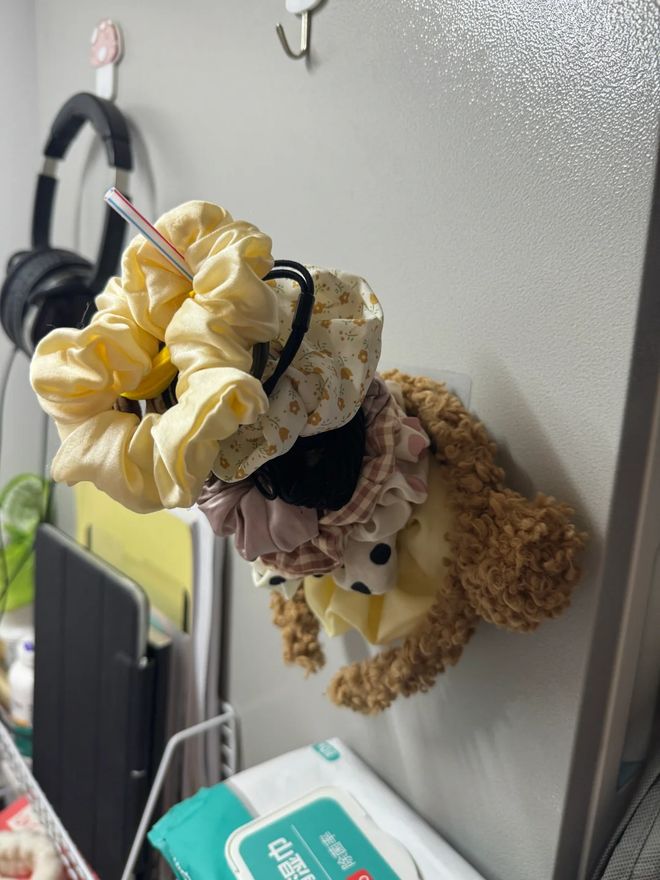 女生扎头发的发圈比较多,这些如果不收纳在一起的话,很容易丢,东一只西一只的,家里的透明粘钩可以挂得住,