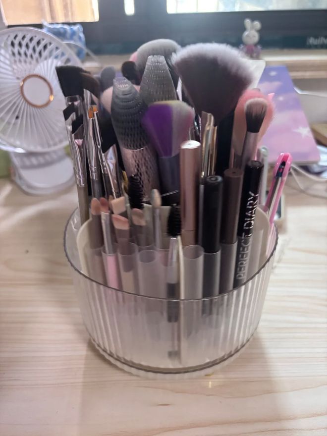 可以使用吸管将化妆刷固定,喝奶茶用的粗一点的吸管,把它们剪成合适的长短,然后固定在收纳盒里面,这样每一根化妆刷都可以插在吸管里面收纳的非常整齐。