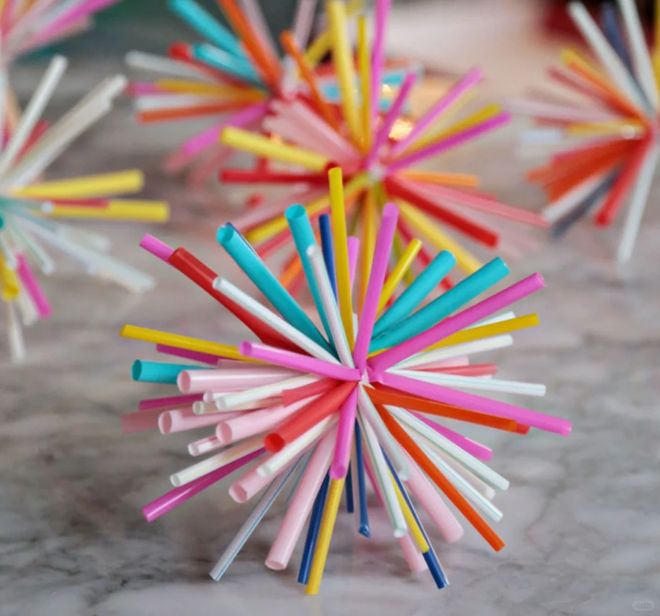 彩色的吸管可以先将吸管剪成想要的长短,然后再用竖条将吸管捆在一起,使劲一拉,就变成了会开花的花球。