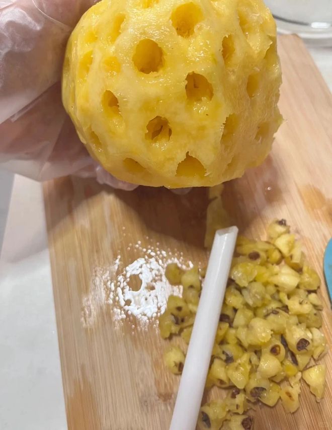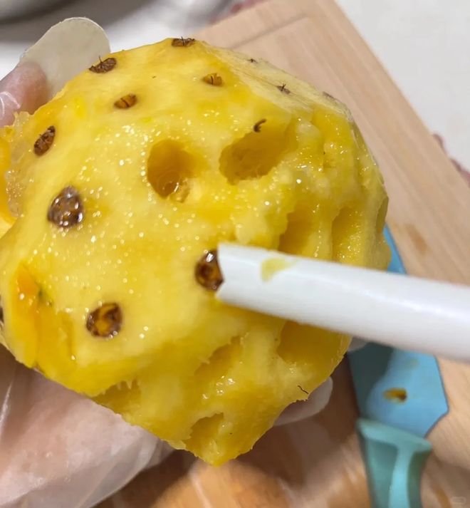 将吸管斜头的一面直接用来挖菠萝,菠萝眼就被清理干净了,虽然不会像专业的工具那么好用,但是也可以用来应急,处理过后的菠萝效果也不错。