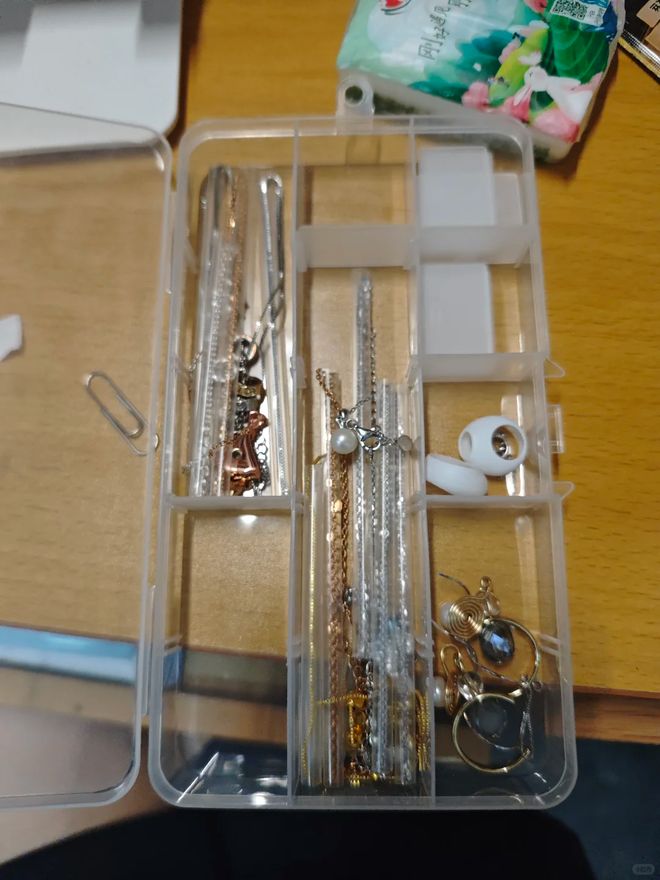 把项链收纳在吸管里面,然后再放进首饰盒里,就不会缠绕在一起,也不会占用太多空间,首饰盒立马就整齐多了。