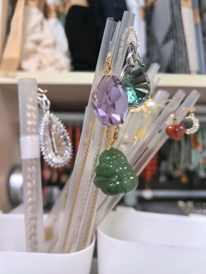 我们可以根据一下项链的长短,然后再将吸管按照需要的尺寸裁剪,把项链装在吸管里面,吊坠可以露在外面,这样拿取很方便,每一根项链都是独立的,不容易缠绕在一起。